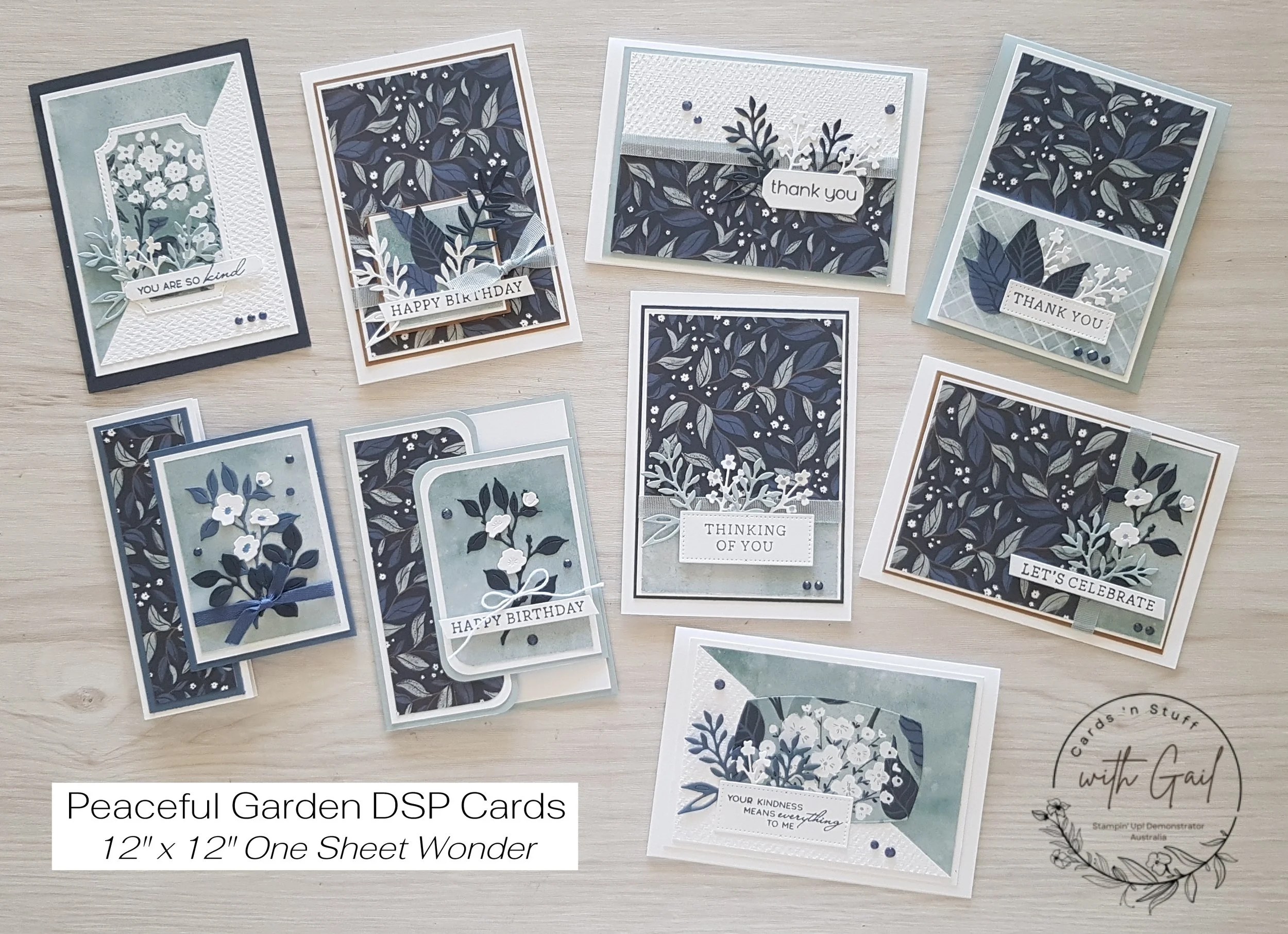 A collection of 10 cards, all made using the same 6” x 6” One Sheet Wonder template for all pieces of the Brushed with Beauty DSP.
